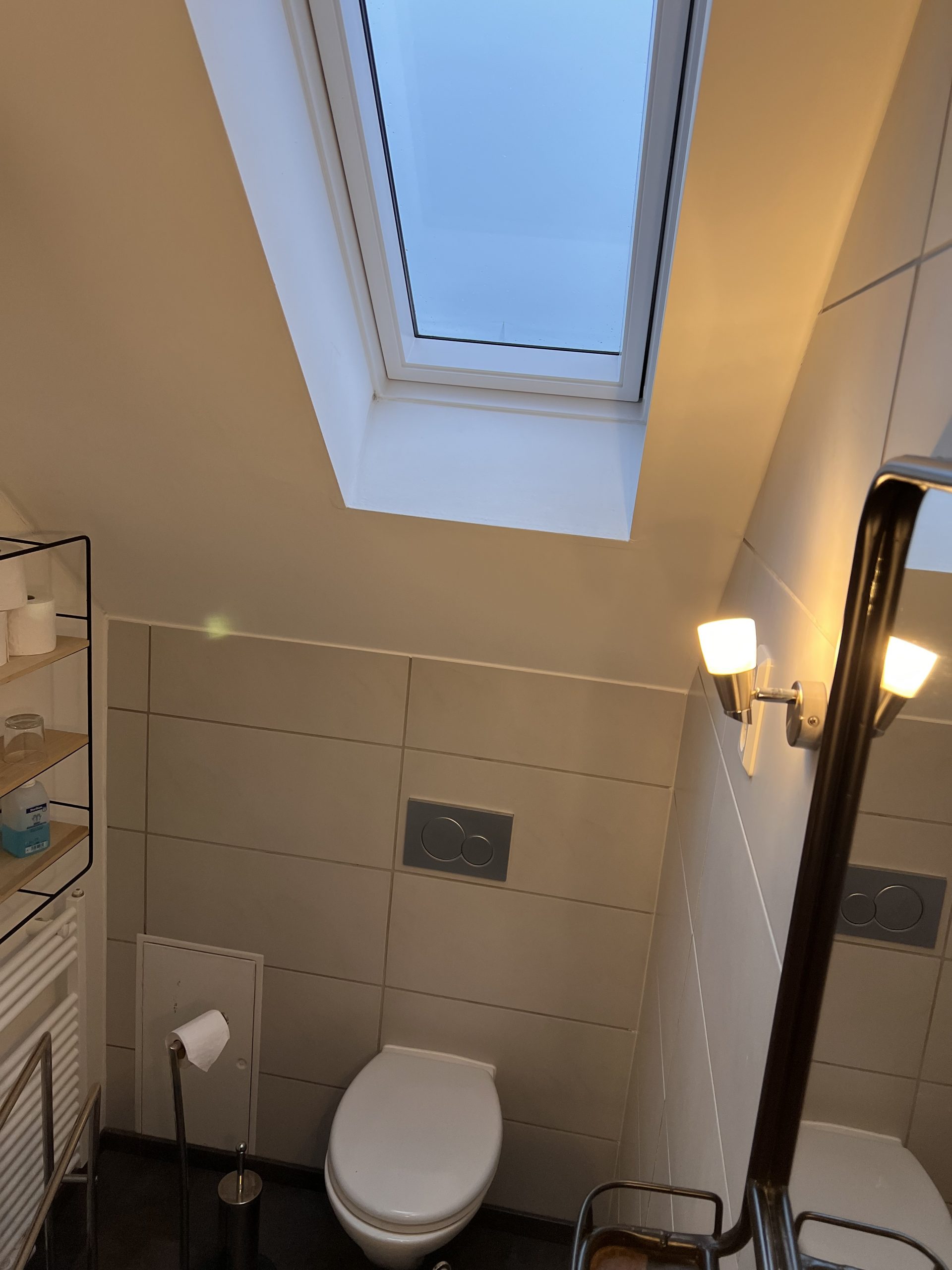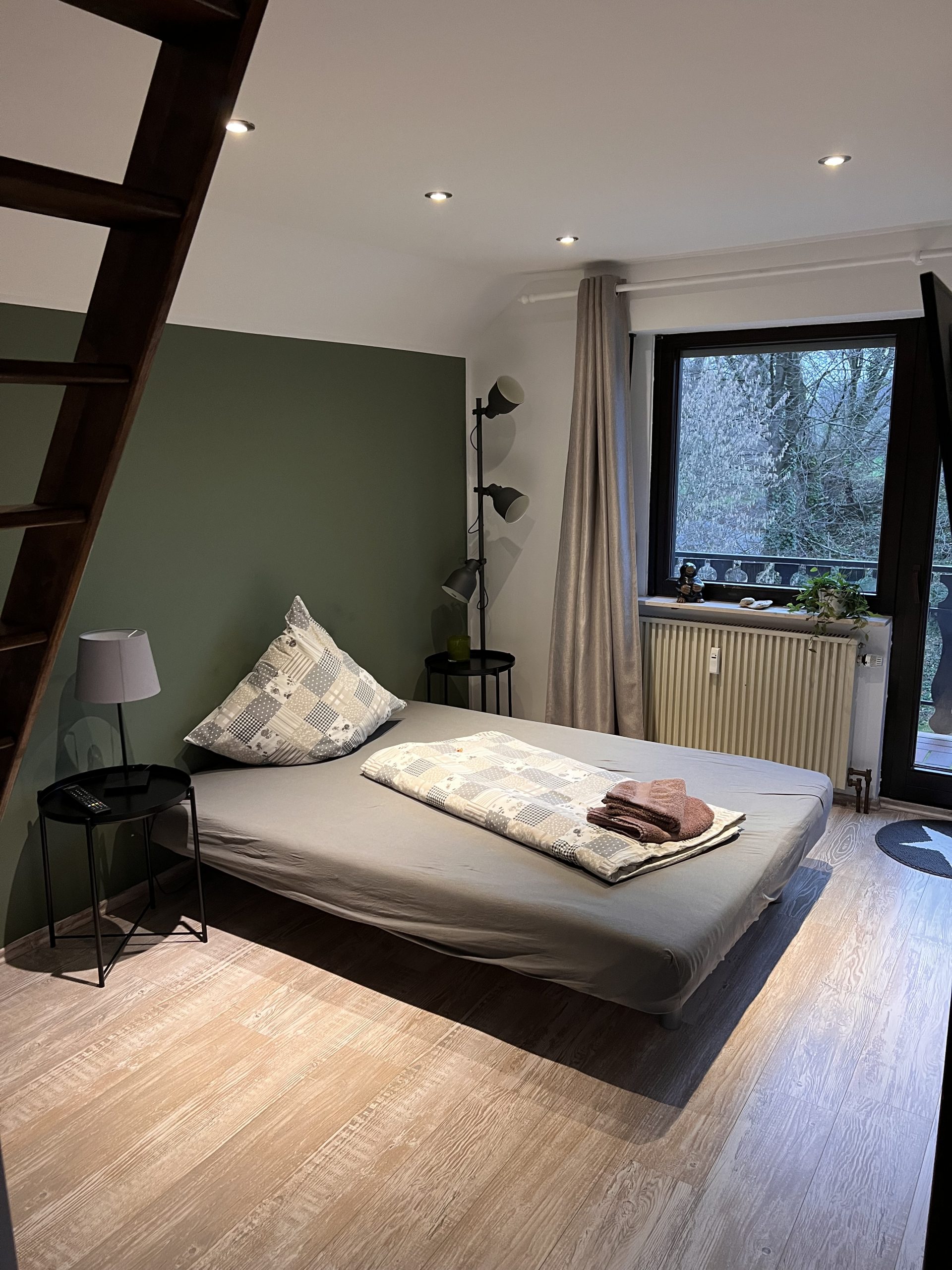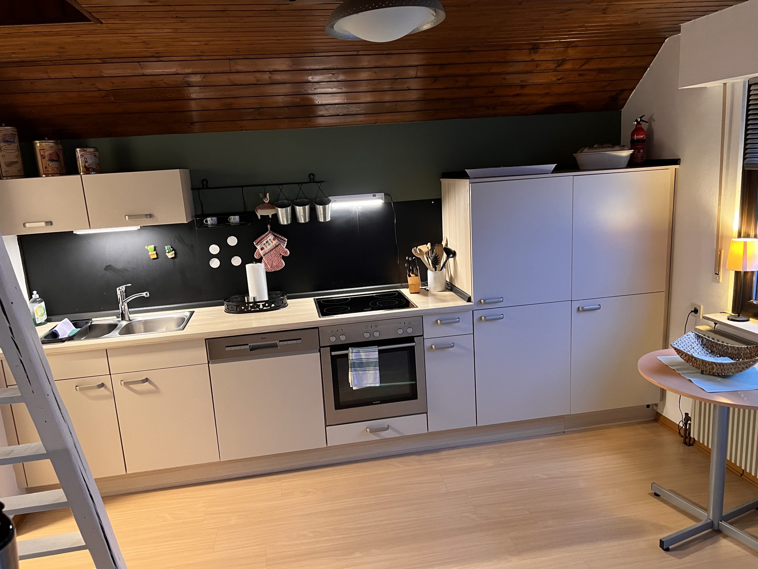 Die Ferienwohnung präsentiert sich im Grunde wie ein eigenständiges kleines Haus. Im Erdgeschoss befindet sich die großräumig angelegte Wohn- / Essküche mit angeschlossenem Wohnzimmer. Über die Treppe gelangt man in das Obergeschoss mit herrlicher Aussicht in die Natur. Ebenso befinden sich dort die beiden Schlafzimmer, sowie ein Badezimmer mit Dusche. Die Wohnung ist im März 2014 fertig gestellt worden und ist somit neuwertig.